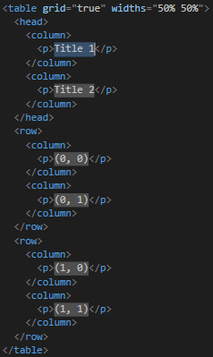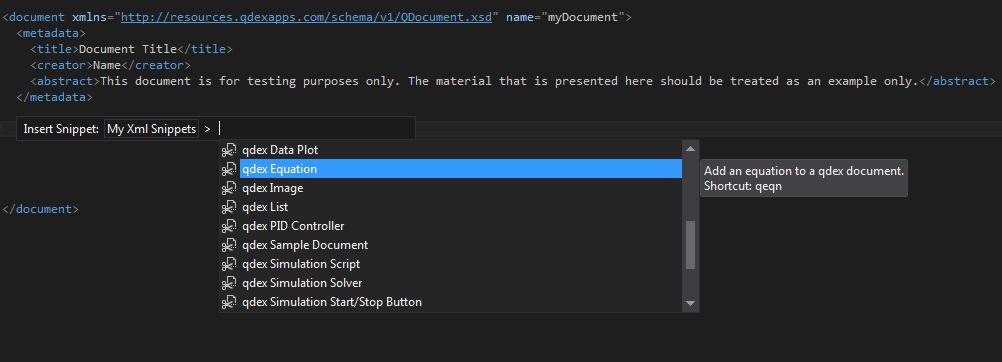 To add a snippet, you can open a bracket <, press Esc to close the IntelliSense menu, then enter the appropriate shortcut followed by the Tab key. For example, to create a table open a bracket and type qtable followed by a tab. The snippet will automatically appear, with several customizable fields pre-populated and highlighted.